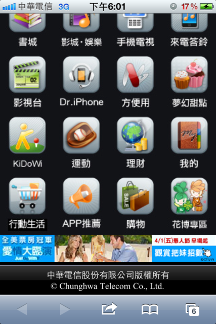 例如:新聞,股票,天氣,星座、命理,書城,影城、娛樂,手機電視,來電答鈴,影視台,Dr.iphone,方便用,夢幻甜點,kiDoWi,運動,理財,我的,行動生活,APP推薦,購物,花博專區。
