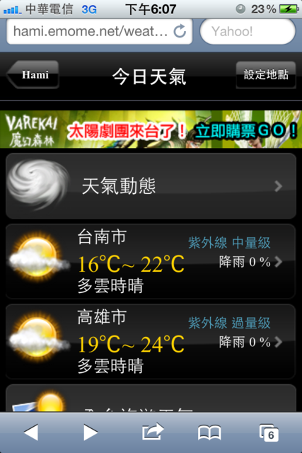 天氣:讓出外出能掌握天氣變化,這個功能,能直接在手機馬上能查詢,不用上網再額外查詢。