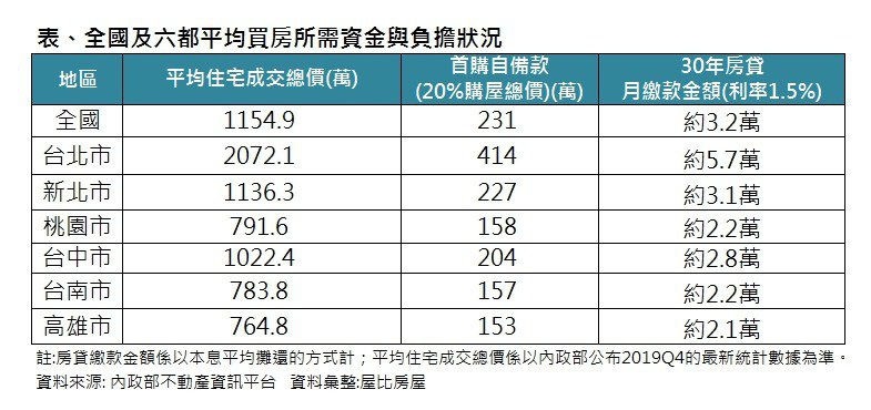 以首購族來說,想買房大約需要準備20%的自備款,而目前六都,以台北買房壓力最高,平均需要先準備400萬以上的自備款,新北市、台中市都要準備200萬上下的自備款,桃園、台南、高雄大約需150萬左右,才有機會買到一般需求的房子。